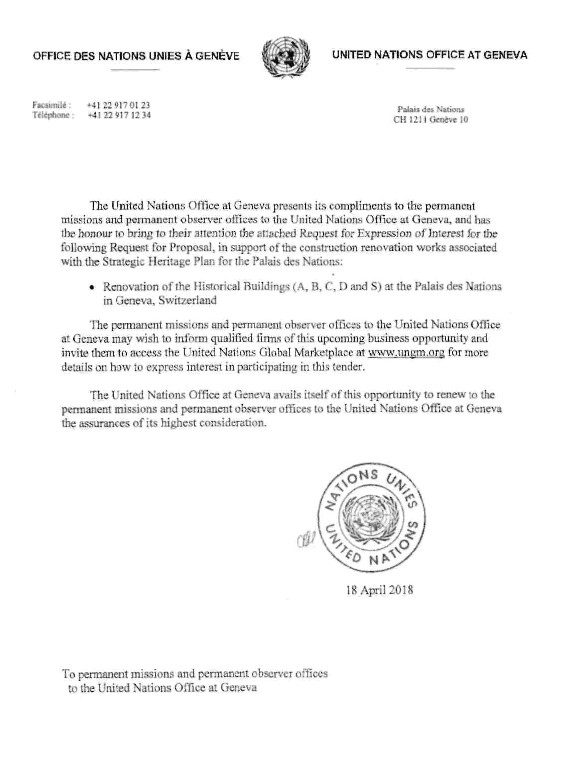 ОГОЛОШЕНО ТЕНДЕР НА РЕКОНСТРУКЦIЮ ІСНУЮЧИХ ПРИМIЩЕНЬ ВIДДIЛЕННЯ ООН У ЖЕНЕВI