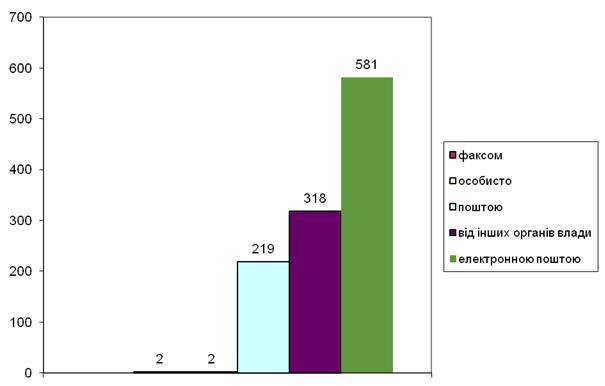 2 – факсом; 2 – особисто; 219 – поштою; 318 – від інших органів влади; 581 – електронною поштою.
