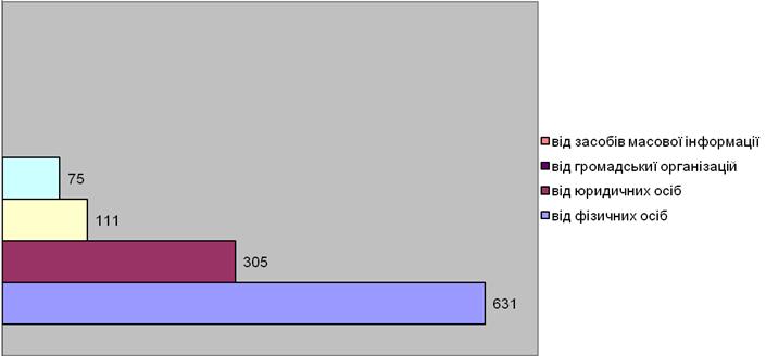 111 – від громадських організацій; 75 – від засобів масової інформації; 305 – від юридичних осіб; 631 – безпосередньо від громадян.