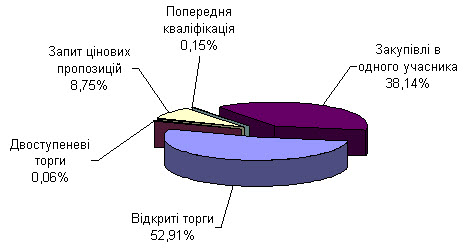 За даними веб-порталу протягом січня – червня 2012 року замовниками було опубліковано в інформаційному бюлетені “Вісник державних закупівель” та оприлюднено на веб-порталі 74 548 оголошень про проведення процедур закупівлі. Серед них, найбільшу частку 52,9 відсотка – це оголошення про проведення закупівель за процедурою відкритих торгів, яка є найбільш конкурентною і прозорою процедурою (Рис. 1).