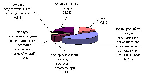 При цьому, згідно з даними веб-порталу, в структурі договорів укладених за процедурою закупівлі в одного учасника найбільшу долю мають договори про закупівлю НАК “Нафтогаз” цінних паперів (43 320 877,3 тис. грн.) та договори на закупівлю комунальних послуг, зокрема, газу природного та послуг з транспортування природного газу магістральними та розподільними трубопроводами – 91 342 605,0 тис. грн.; електричної енергії та послуг з постачання електроенергії - 12 776 032,3 тис. грн.; послуг з постачання водяної пари і гарячої води (послуг з постачання теплової енергії) - 9 879 529,8 тис. грн.; послуг з водопостачання та водовідведення - 1 612 741,6 тис. грн. (Рис. 2).