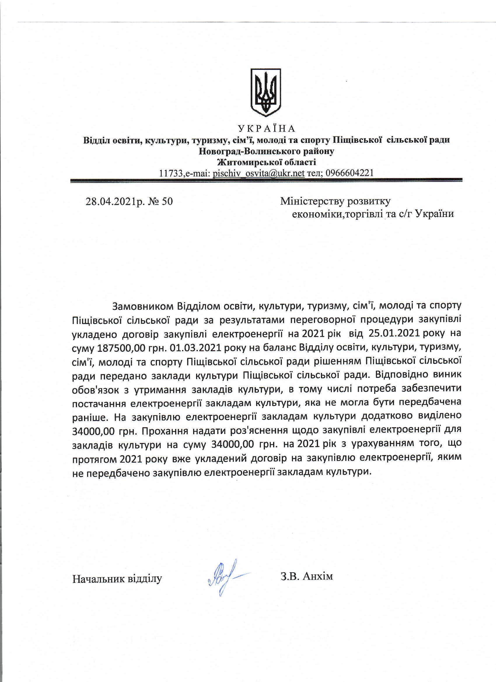| Суть питання: | Замовником Відділом освіти, культури, туризму, сім'ї, молоді та спорту Піщівської сільської ради за результатами переговорної процедури закупівлі укладено договір закупівлі електроенергії на 2021 рік від 25.01.2021 року на суму 187500,00 грн. 01.03.2021 року на баланс Відділу освіти, культури, туризму, сім'ї, молоді та спорту Піщівської сільської ради рішенням Піщівської сільської ради передано заклади культури Піщівської сільської ради. Відповідно виник обов'язок з утримання закладів культури, в тому числі потреба забезпечити постачання електроенергії закладам культури, яка не могла бути передбачена раніше. На закупівлю електроенергії закладам культури додатково виділено 34000,00 грн. Прохання надати роз'яснення щодо закупівлі електроенергії для закладів культури на суму 34000,00 грн. на 2021 рік з урахуванням того, що протягом 2021 року вже укладений договір на закупівлю електроенергії, яким не передбачено закупівлю електроенергії закладам культури. |