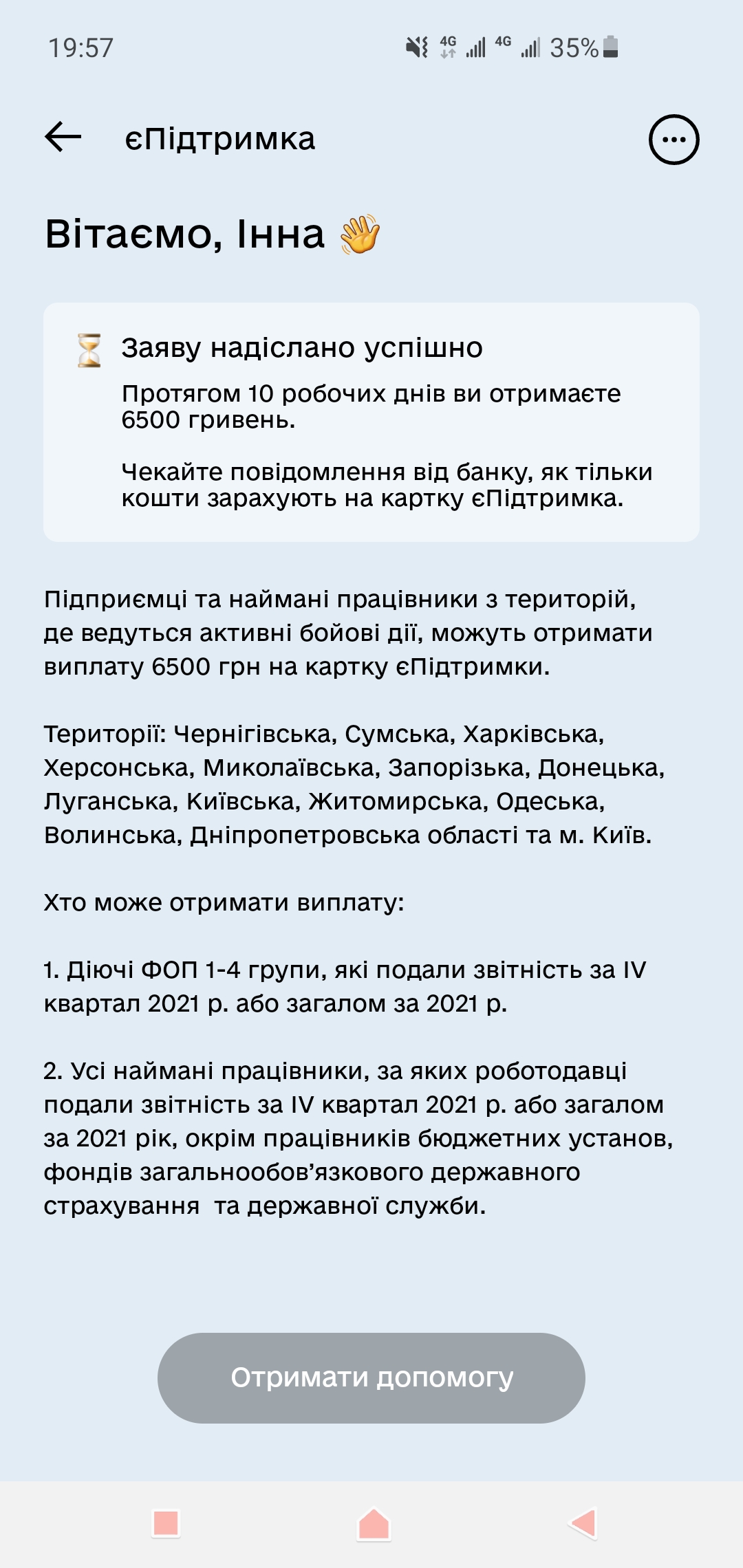| Тема розширена: | не отримала допомогу 6500 за програмою єПідтримка | |||