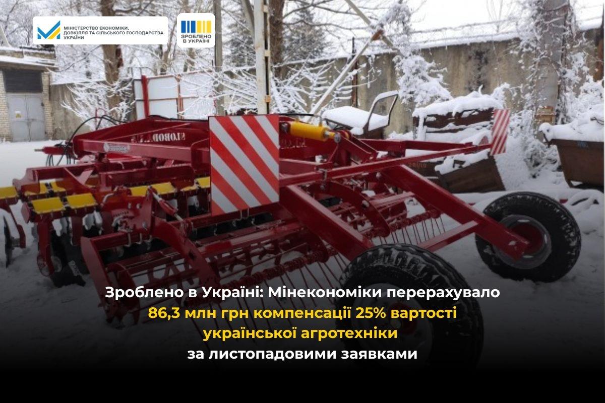 У листопаді 2025 року аграрії подали 401 заявку на компенсацію вартості 771 одиниці сільськогосподарської техніки та обладнання українського виробництва. Загальна вартість придбаної техніки склала 414,2 млн грн. Держава компенсувала 86,3 млн грн.