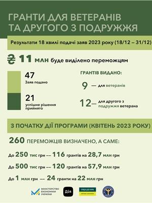 Серед 21 переможця останньої у 2023 році хвилі подачі заяв на гранти 9 учасників бойових дій, 12 членів родин ветеранів. 4 переможці отримали грант розміром до 1 млн грн, 12 - до 500 тис грн, 5 - до 250 тис грн.