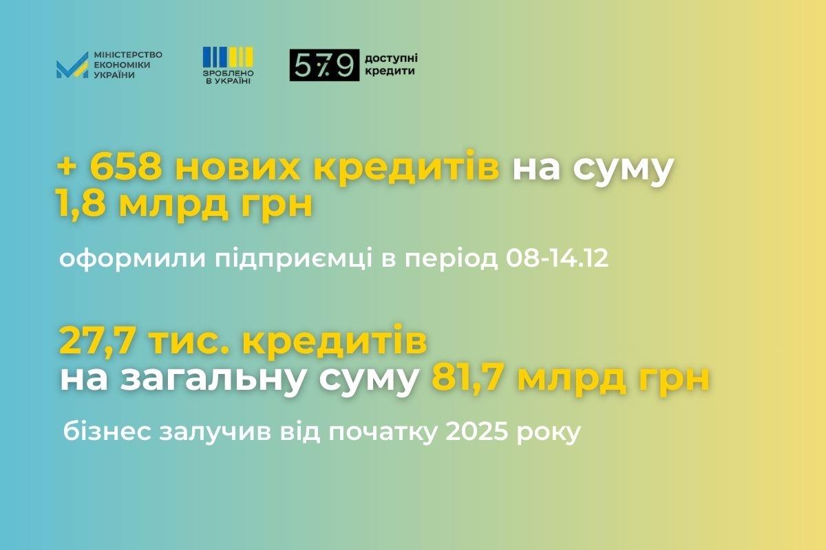 15.12.2025 | 15:15 | Відділ зв’язків з громадськістю та засобами масової інформаціїЗа минулий тиждень підприємці оформили 658 нових кредитів на суму 1,8 млрд грн.