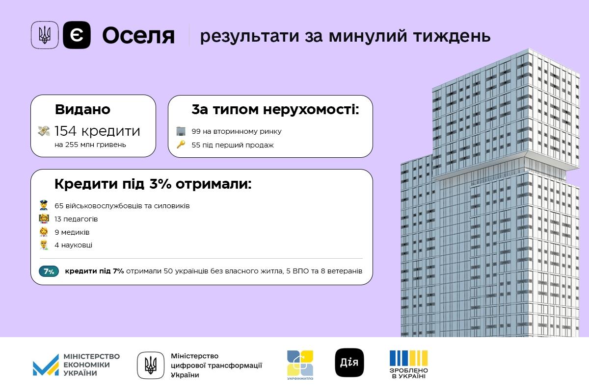 «Загалом, від початку дії програми доступних кредитів єОселя 11 887 родин отримали кредити на житло на суму понад 18,9 млрд грн. Зокрема, українці отримали 8,5 тис. кредитів на придбання житла на вторинному ринку, майже 3,5 тис. – на первинному ринку. 278 кредитів отримали на придбання приватних будинків. Програма єОселя не лише дає можливість на вигідних умовах придбати житло та покращити умови проживання, але також стимулює галузь будівництва та сферу нерухомості, що є важливою умовою для швидкої відбудови України», – зазначила Надія Бігун.