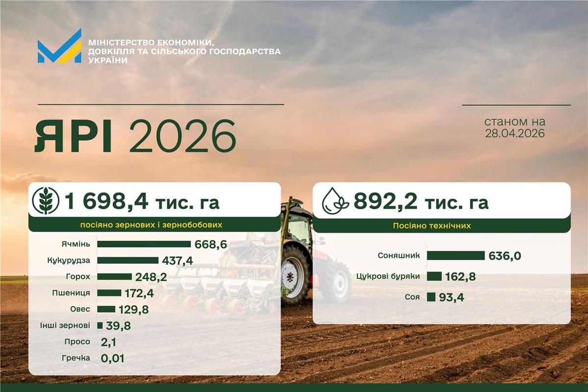 Станом на 28 квітня 2026 року українські аграрії активно продовжують весняну посівну кампанію. Загалом за всіма категоріями господарств уже засіяно 1 698,4 тис. га ярих зернових та зернобобових культур, що становить 28% від прогнозованих площ.