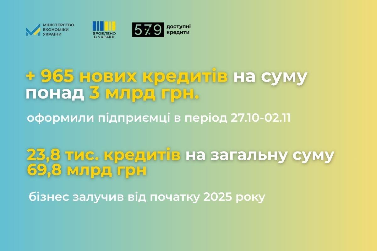 05.11.2025 | 09:20 | Відділ зв’язків з громадськістю та засобами масової інформаціїЗа минулий тиждень підприємці оформили 965 нових кредитів на суму понад 3 млрд грн.