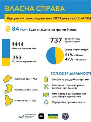 “За результатами дев’ятої цього року хвилі подачі заяв на мікрогранти 353 українця визнано переможцями. Вони отримають від держави фінансову підтримку на започаткування або розширення свого бізнесу більше ніж на 84 млн грн. Загалом з початку дії програми “Власна справа” можливістю отримати мікрогрант скористались майже 6 тисяч українців. 5 тисяч з них вже отримали кошти на загальну суму 1,2 млрд грн та реалізують свої бізнес-проекти, працюють, сплачують податки, створюють нові робочі місця. За рік дії програми отримувачі мікрогрантів створять понад 14 тисяч робочих місць”, - повідомила Тетяна Бережна.