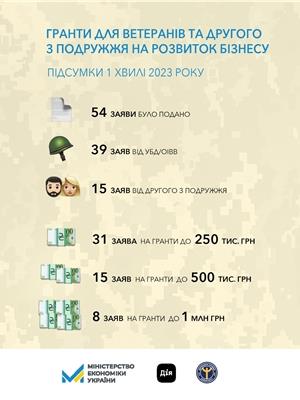 “54 українських захисників та захисниць скористались можливістю отримати від держави фінансову підтримку на розвиток власної справи та подали заявки на гранти для ветеранів у першу хвилю. Максимальну суму гранту в 1 млн грн запросили 5 заявників, 15 заяв надійшло від другого з подружжя ветерана на грант до 500 тис грн. Зазначу, що 80% заявників попросили гранти за програмами, що передбачають співфінансування, тобто вони готові розділити відповідальність з державою за розвиток свого бізнесу і планують вкласти у свій проект 30% власних коштів. Загалом ветерани запросили грантів на 21 млн грн та мають намір реалізувати свої бізнес-проекти, вартістю понад 32 млн грн”, - зазначила Тетяна Бережна.