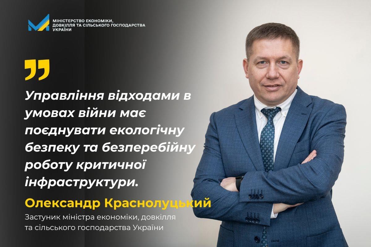 «Управління відходами в умовах війни має поєднувати екологічну безпеку та безперебійну роботу критичної інфраструктури. Завдання держави — забезпечити зрозумілі та ефективні правила, які дозволять бізнесу працювати стабільно й відповідально», — зазначив Олександр Краснолуцький.