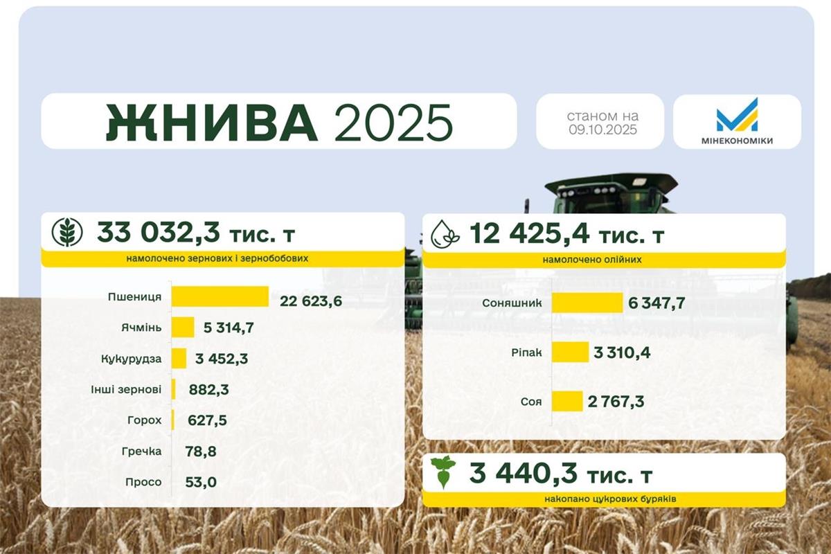 Олійних культур на 10 жовтня 2025 року зібрано 12 425,4 млн тонн. Зокрема: