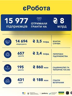 «Грантові програми для започаткування й розвитку малого та середнього бізнесу - один з ключових напрямків нашої політики “Зроблено в Україні”, яка спрямована на підтримку вітчизняного виробника та стимулювання попиту на українські товари й послуги. Від початку запуску грантових програм єРобота держава інвестувала в розвиток підприємництва через гранти 8 мільярдів гривень. На сьогодні грантові кошти вже отримали майже 16 тисяч підприємців в усіх регіонах країни. Тисячі нових компаній та діючих підприємств отримали державну підтримку для зростання, масштабування бізнесу, нарощування обсягів виробництва, опанування нових напрямків діяльності, виходу на нові ринки. Вони працюють, сплачують податки, створюють робочі місця. Загалом отримувачі грантів створять понад 47 тисяч нових робочих місць”, - зазначила Юлія Свириденко.