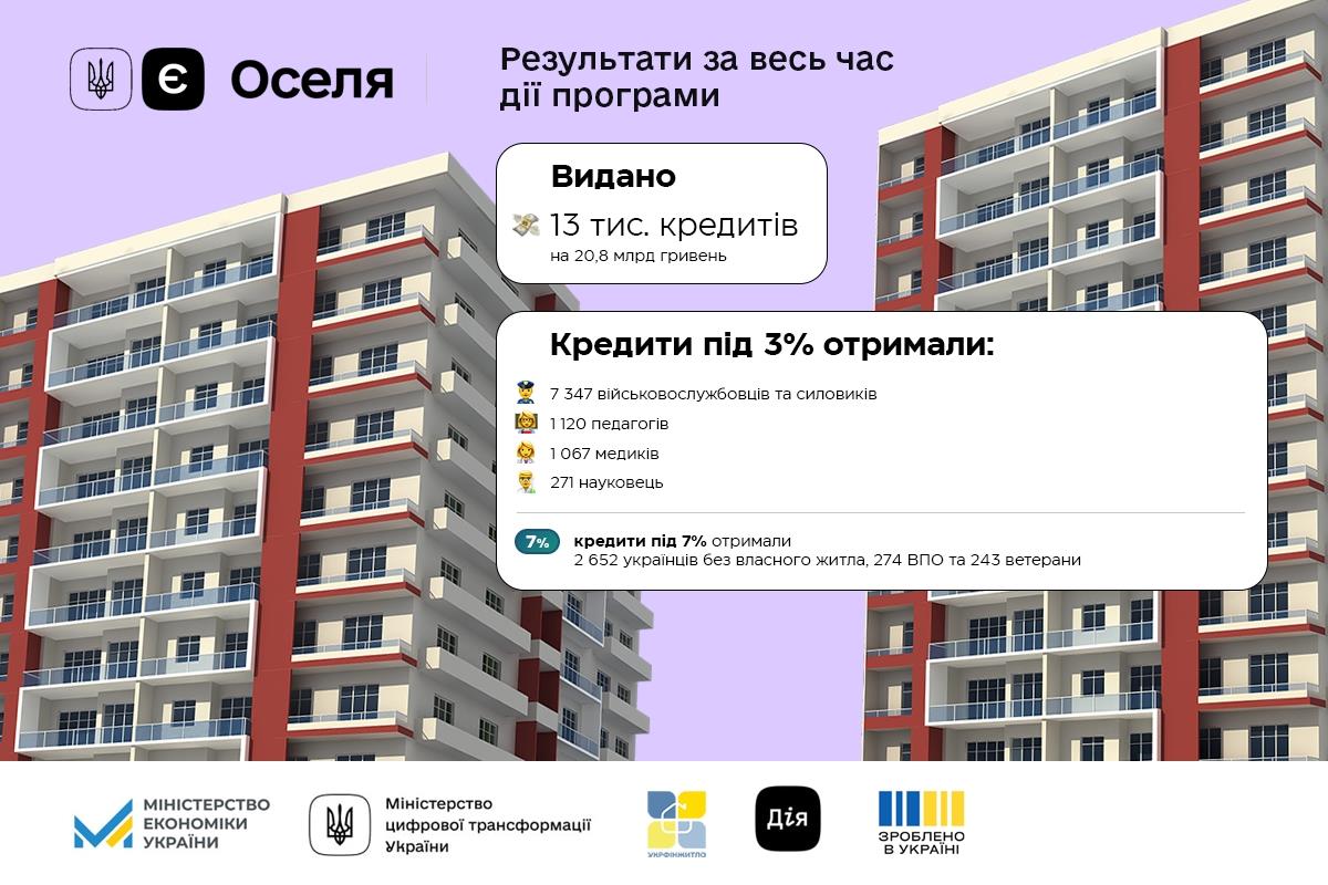«Загалом за весь час реалізації програми доступних кредитів єОселя вже майже 13 тис. українських родин отримали кредити на суму понад 20,8 млрд грн на придбання житла. Програма єОселя є частиною політики «Зроблено в Україні», яка направлена на розвиток українського виробника. Тож крім того, що українці мають змогу придбати житло на вигідних умовах, вітчизняна галузь будівництва отримала додатковий стимул до розвитку завдяки цій програмі», — зазначив Андрій Телюпа.