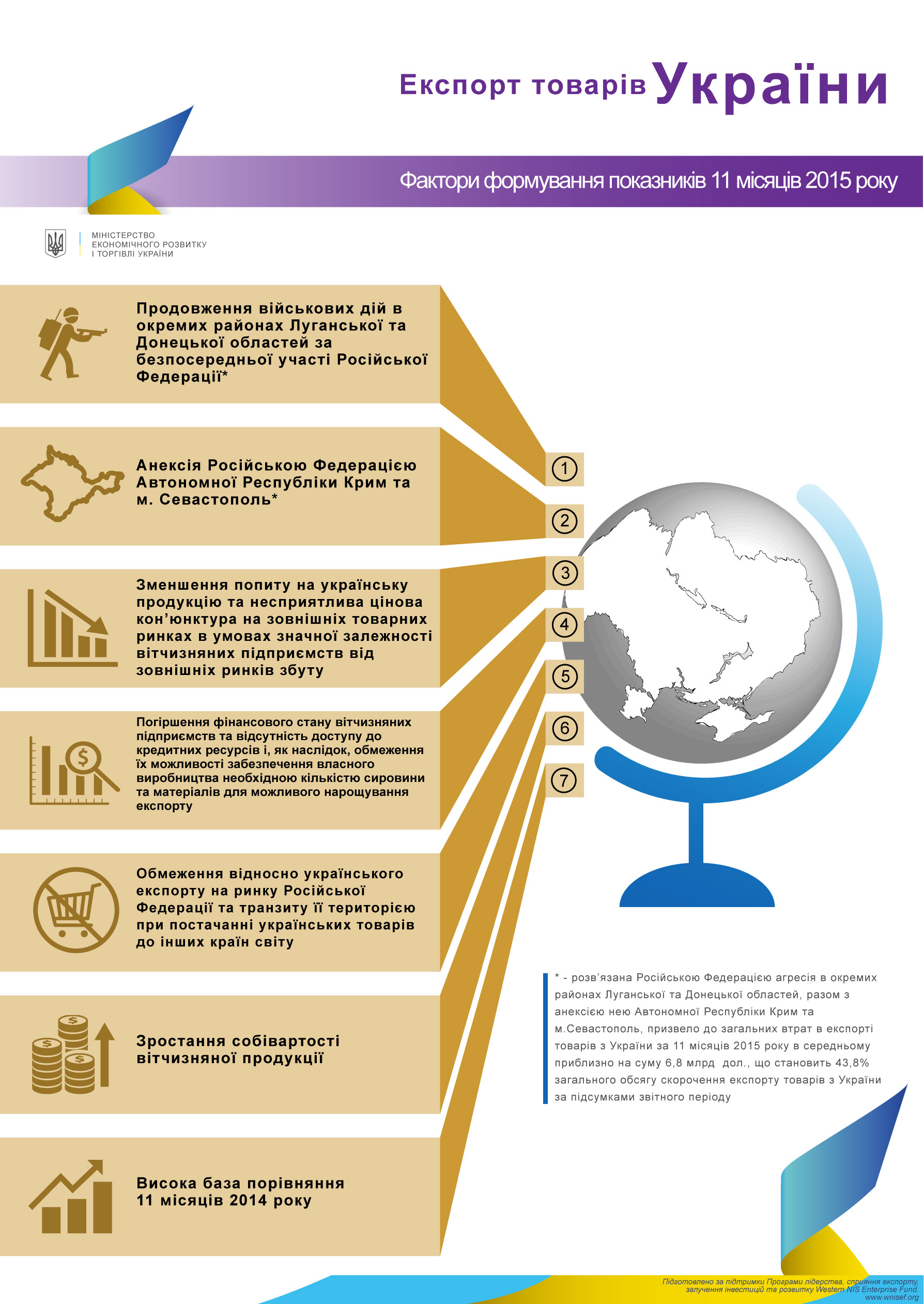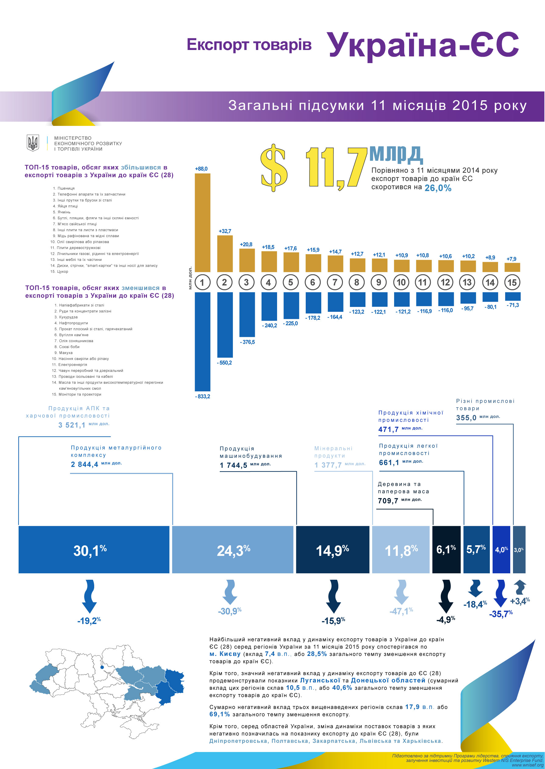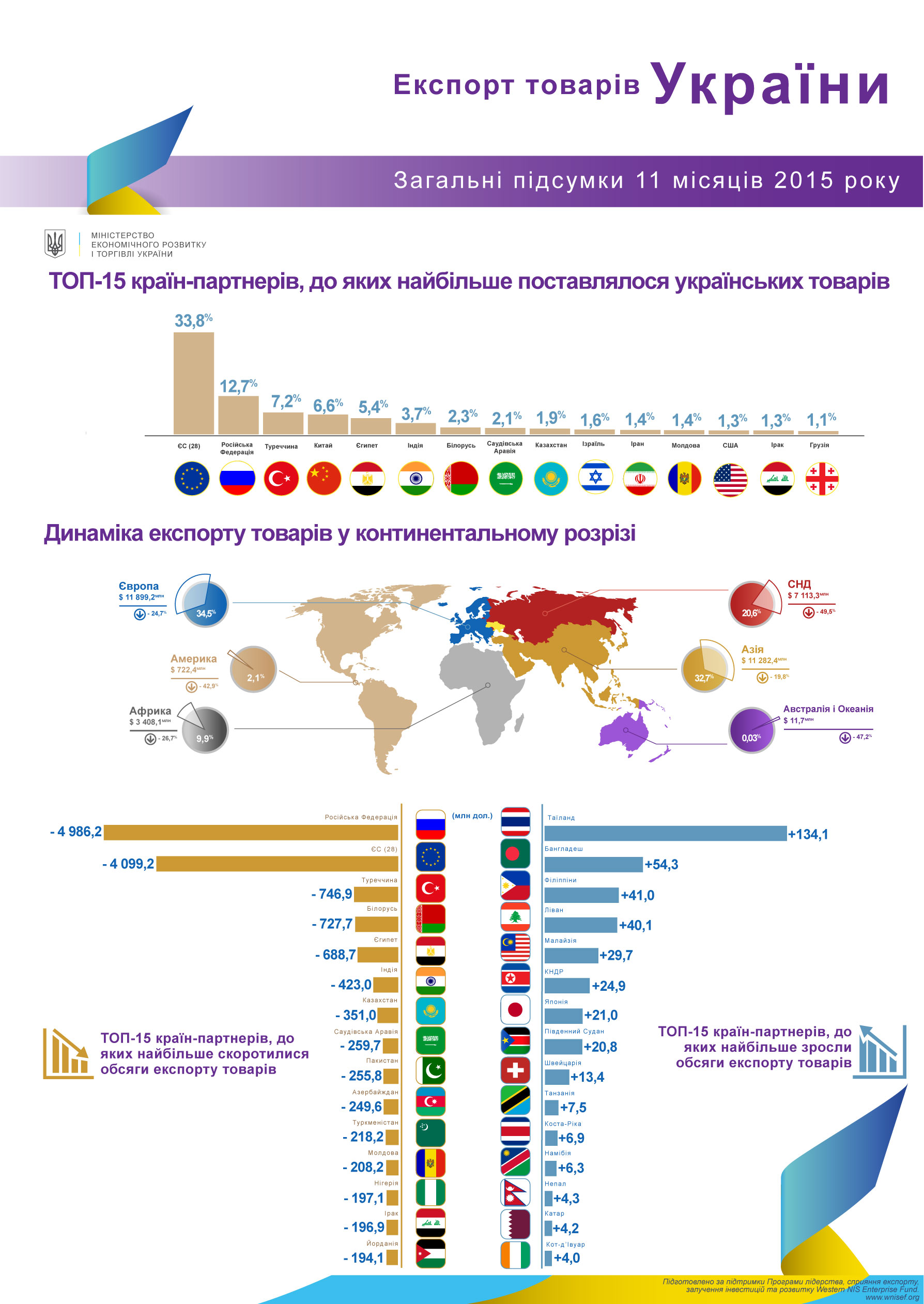 Країни ЄС (28) залишаються найбільшим торговельним партнером України в експорті товарів. Питома вага цих країн за підсумками 11 місяців 2015 року склала 33,8%.