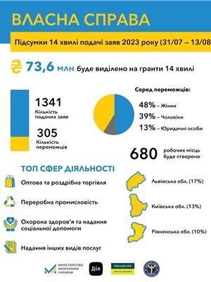 “За результатами чотирнадцятої хвилі подачі заяв на мікрогранти переможцями визнано 305 українців, які отримають 74 млн грн на старт або розширення свого бізнесу. Від початку 2023 року ми вже маємо 4 000 переможців, яким держава надасть фінансову підтримку на майже 1 млрд грн. Інвестиції в розвиток малого бізнесу через грантові програми, які Уряд запустив влітку минулого року, вже повертаються не лише активізацією економіки, а й створенням 17 тисяч нових робочих місць та сплаченими грантоотримувачами податками до бюджету, яких надійшло понад 330 млн грн”, - зазначила Тетяна Бережна.