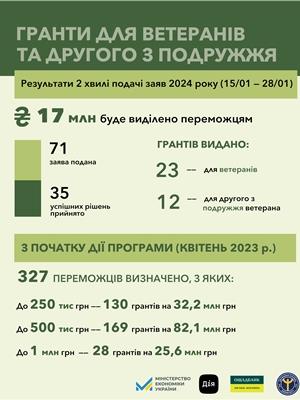 Серед 35 переможців другої у 2024 році хвилі подачі заяв на гранти 23 учасників бойових дій та 12 членів родин ветеранів. 3 переможці отримали грант розміром до 1 млн грн, 27 - до 500 тис грн, 5 - до 250 тис грн.