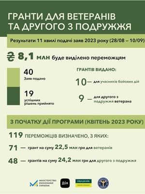 “На сьогодні маємо 119 переможців ветеранського компоненту програми “Власна справа”, які отримають гранти на старт або розширення свого бізнесу на 47 млн грн. Понад 70 з них вже отримали фінансування і можуть вкладати кошти від держави в розвиток власної справи. Нині найбільш активними учасниками грантової програми є ветерани-підприємці з Львівської та Івано-Франківської областей, а також міста Києва. Закликаємо ветеранів та членів їхніх родин скористатись можливостями грантової програми. Якщо після повернення до мирного життя наші захисники і захисниці мають бажання відкрити власну справу - держава готова в це інвестувати”, - зазначила Тетяна Бережна.