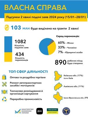 «434 переможці другої у 2024 році хвилі грантової програми “Власна справа” отримають від держави 103 млн грн на старт або розвиток свого бізнесу. При цьому ці підприємці створять майже 1 000 робочих місць. Від початку дії програми в липні 2022 року маємо вже 14 000 грантоотримувачів, в бізнес яких держава інвестує 3,3 млрд грн. Завдяки цим інвестиціям з’явились тисячі нових підприємств, діючі компанії розширили свою діяльність, збільшили обсяги виробництва й асортимент продукції або послуг, освоїли нові напрями. Окрім того, отримувачі грантів загалом створять понад 30 тисяч нових робочих місць”, - зазначила Тетяна Бережна.