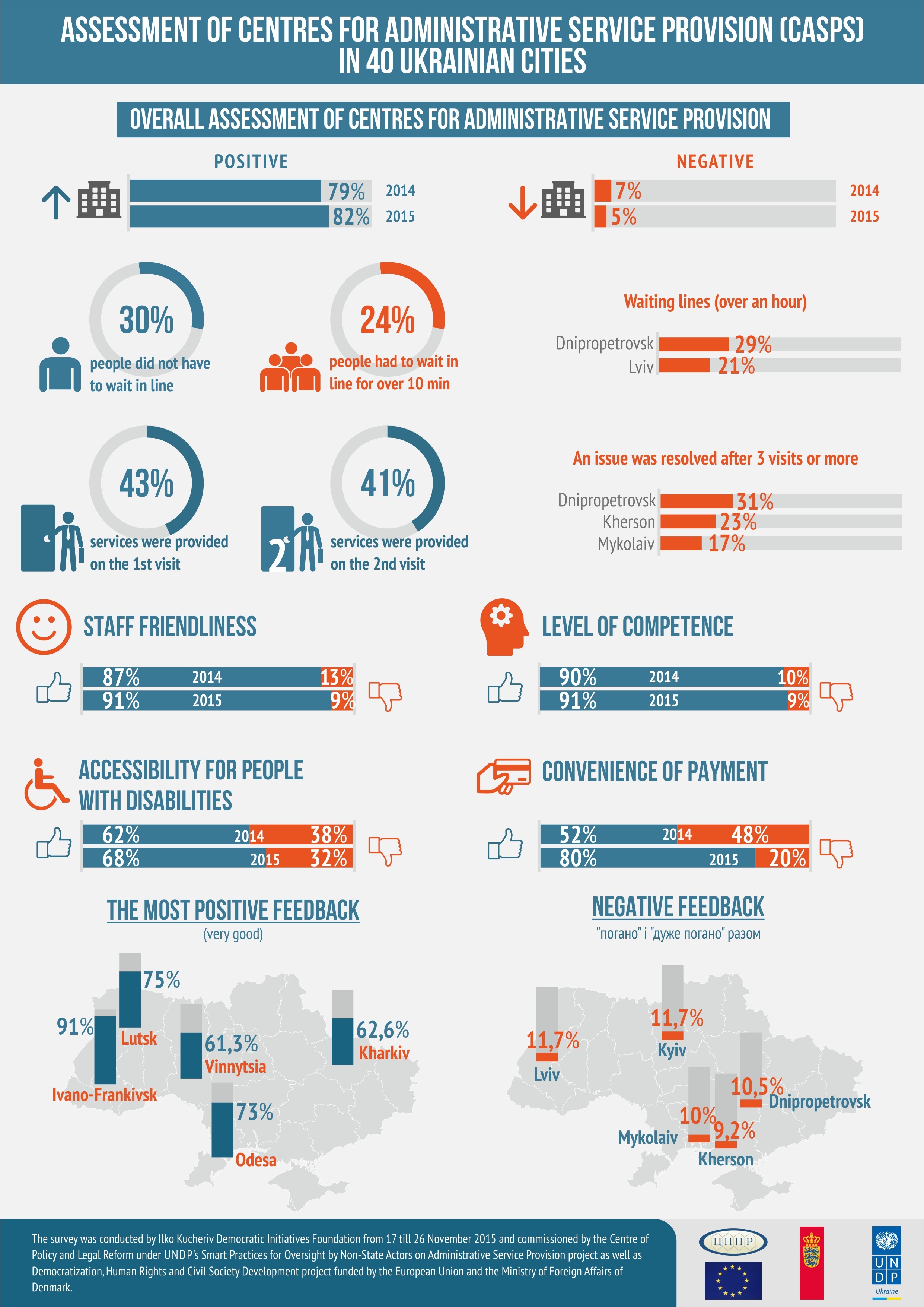 За результатами досліджень, найбільше абсолютних позитивних оцінок отримано від споживачів послуг ЦНАПів: Івано-Франківська (91%), Луцька (75%), Одеси (73%), Харкова (62,6%), Вінниці (61,3%).