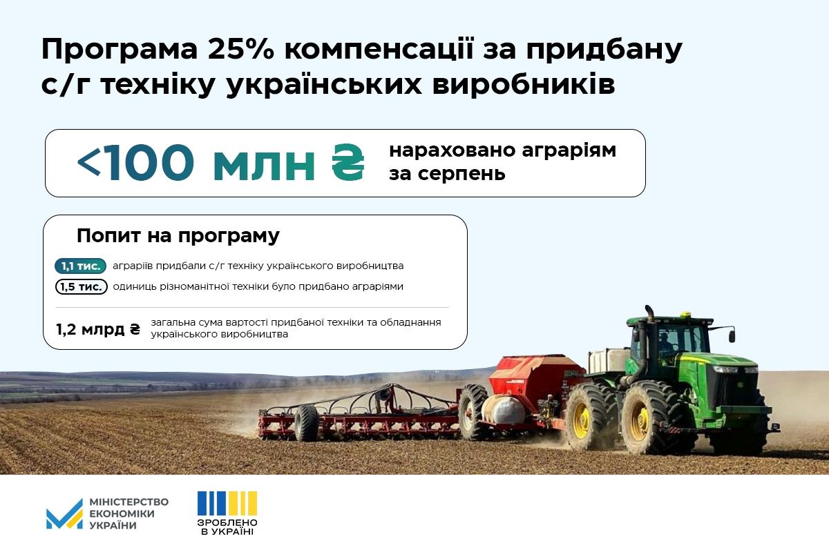 У вересні аграріям нарахували 25% компенсації за придбану у серпні сільгосптехніку та обладнання українського виробництва на загальну суму 98,5 млн грн. Про це повідомила Перша віцепрем'єр-міністерка України — Міністерка економіки України Юлія Свириденко.
