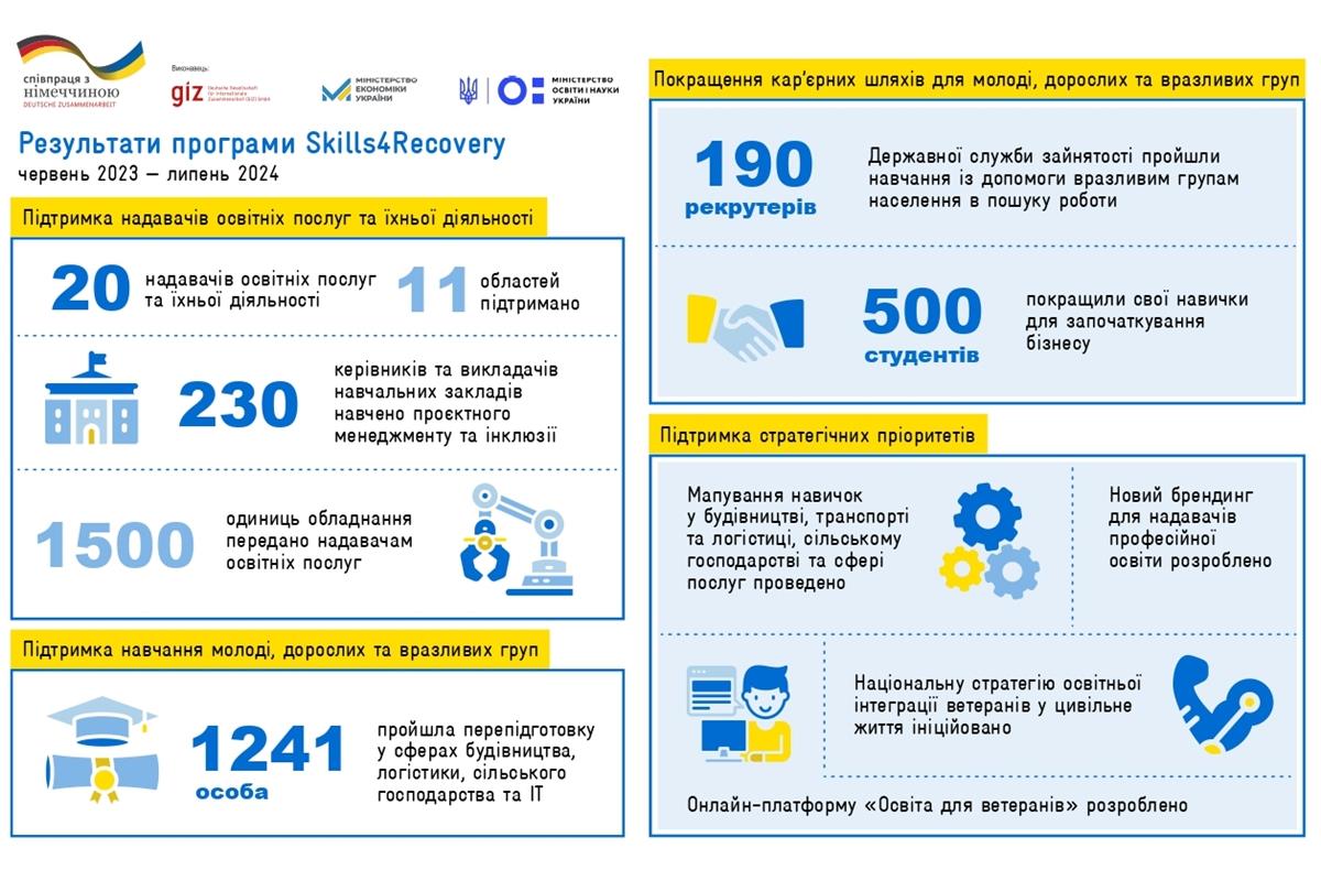 Програма «Професійна освіта в Україні / Skills4Recovery» спрямована на підтримку навчання та перепідготовку кваліфікованої робочої сили в чотирьох секторах економіки, важливих для процесу відновлення: будівництво, транспорт і логістика, сільське господарство та сфера послуг. Ця мета досягається через зміцнення спроможності надавачів послуг професійної освіти пропонувати якісні й орієнтовані на ринок праці освітні послуги, залучати вразливі групи населення і співпрацювати з роботодавцями. Програма реалізується Deutsche Gesellschaft für Internationale Zusammenarbeit (GIZ) GmbH, що діє за дорученням Федерального Уряду Німеччини. Програма Skills4Recovery триває із середини 2023 до середини 2026 року та охоплює шість областей (Львівську, Вінницьку, Чернівецьку, Київську, Полтавську та Дніпропетровську).