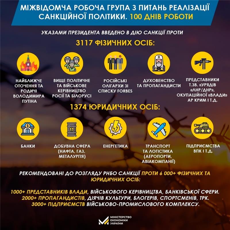 За 100 днів роботи Міжвідомчої робочої групи з питань реалізації санкційної політики Рада національної безпеки та оборони ухвалила, а Президент України своїми указами ввів в дію санкції проти 3117 фізичних осіб та 1374 юридичних осіб. Попередньо ухвалені санкції були опрацьовані МРГ та рекомендовані до розгляду РНБОУ.
