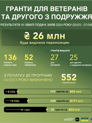 Серед 52 переможців сьомої хвилі подачі заяв на гранти 27 учасників бойових дій та 25 членів родин ветеранів. 46 переможців отримали грант розміром до 500 тис грн, 4 - до 250 тис грн, 2 - до 1 млн грн.