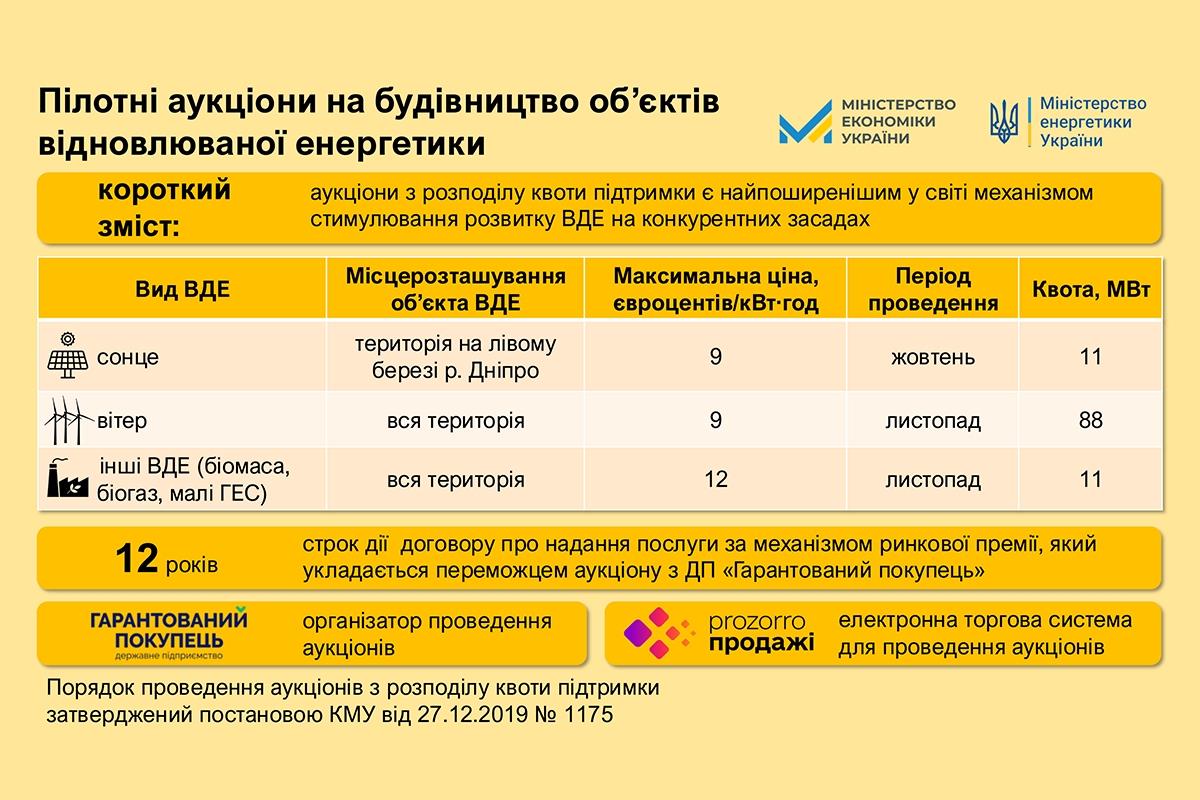Відповідно до графіка, пілотні аукціони з розподілу квоти підтримки планується провести вже у жовтні-листопаді цього року за процедурою, визначеною Порядком проведення аукціонів з розподілу квоти підтримки, затвердженим постановою КМУ від 27.12.2019 № 1175.