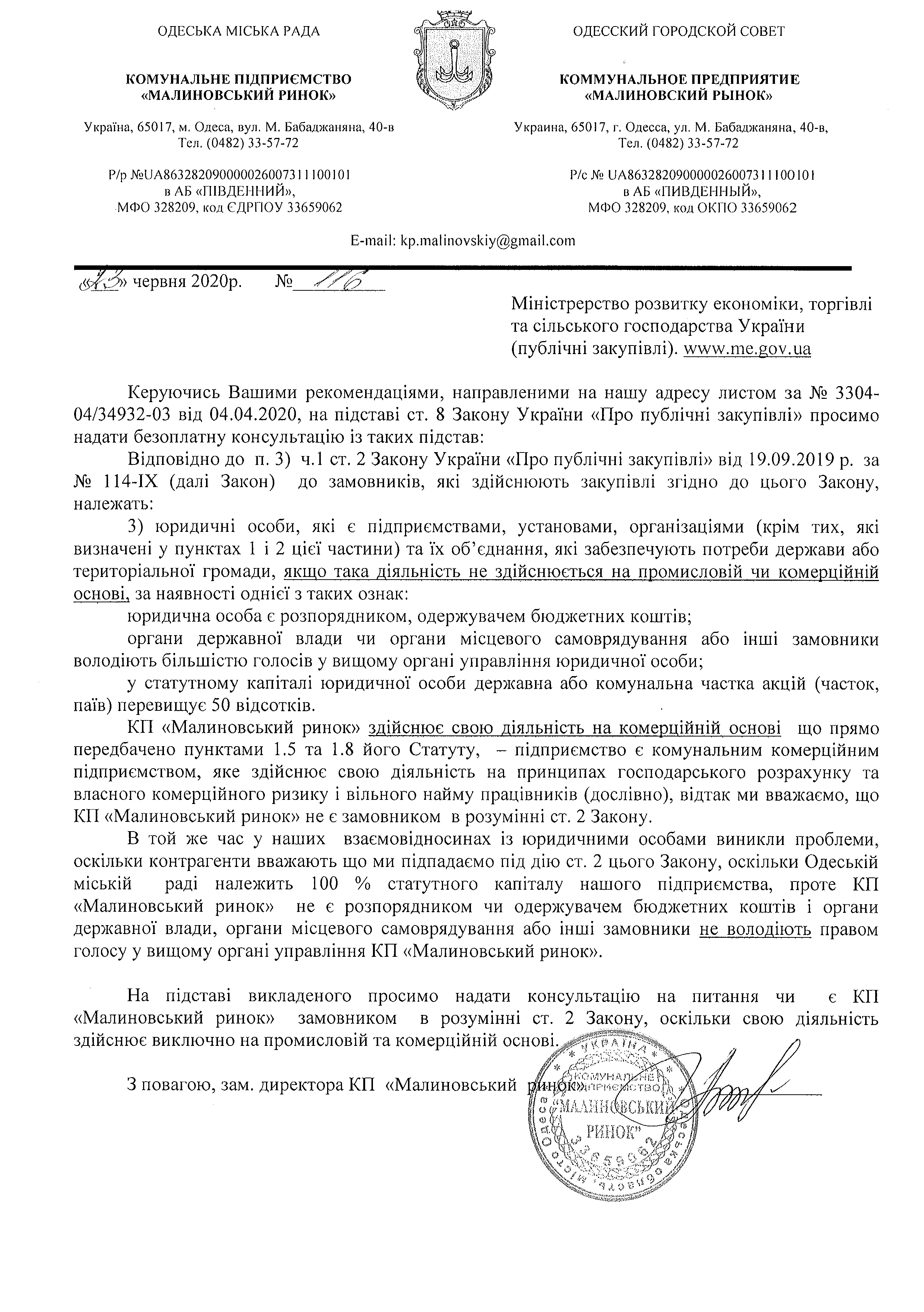 | Суть питання: | Просимо надати консультацію на питання чи є КП "Малиновський ринок" замовником в розумінні ст. 2 Закону, оскільки свою діяльність здійснює виключно на промисловій та комерційній основі. | |||